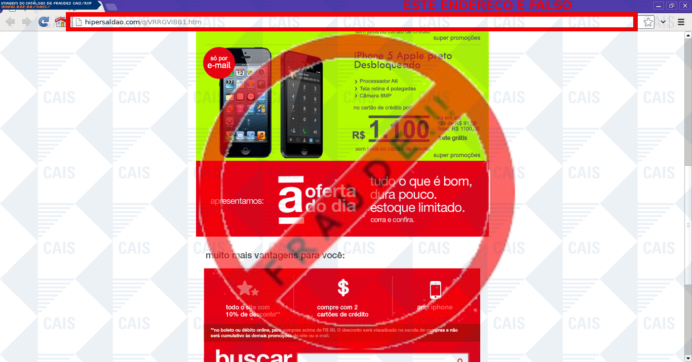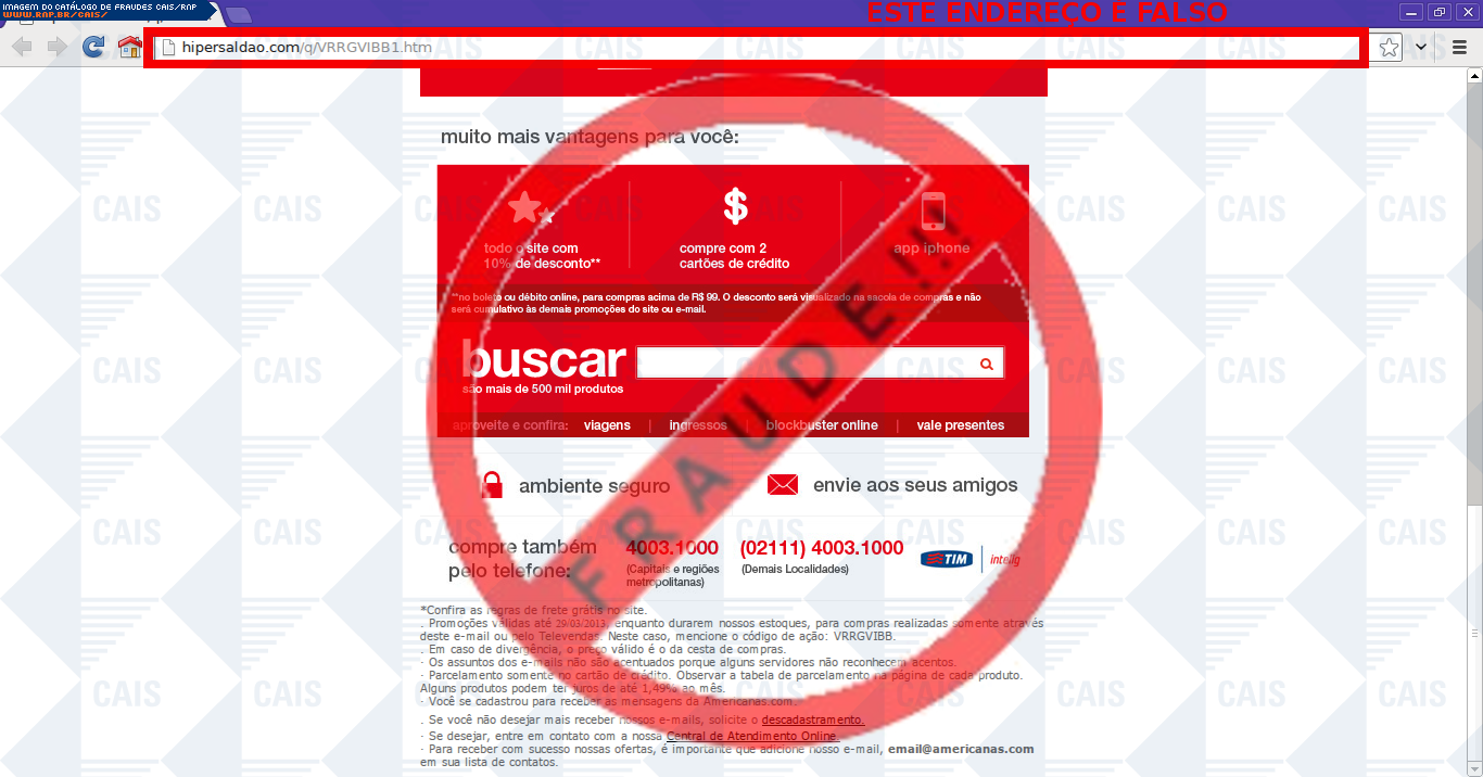 | comentário | O usuário recebe uma mensagem contendo um banner de uma promoção de produtos para compra online de uma loja bastante conhecida no meio, mas ao clicar em uma das imagens do e-mail o mesmo é levado a uma pagina falsa, muito semelhante a pagina original, mas... (leia mais) | |