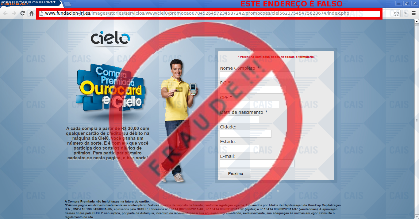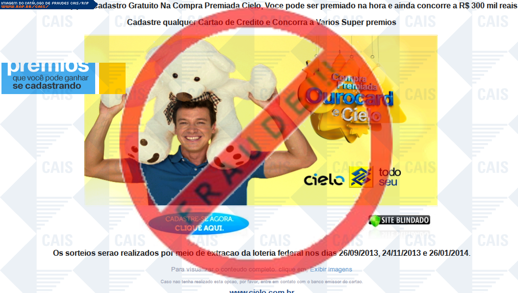 | comentário | O fraudador envia um e-mail ao usuário convidando-o para participar de uma promoção de empresas de cartões de credito, mas o link para o cadastro leva o usuário para uma pagina falsa usada na pratica de phishing. | |