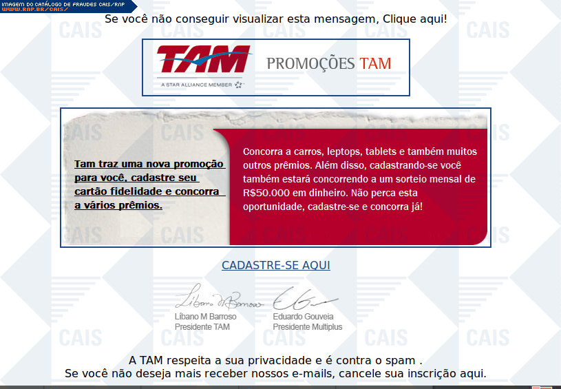 | comentário | Falsa promoção em nome da TAM oferece R$50.000 em dinheiro, além de outros prêmios. Há um link para realizar cadastro na promoção, que provavelmente trata-se de uma fraude para coletar dados importantes. | |
