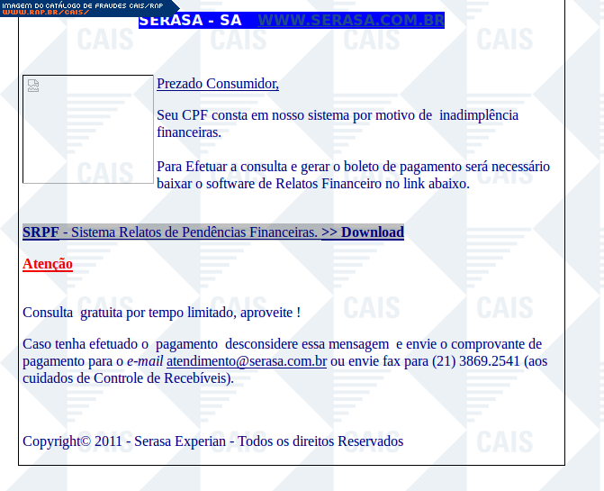 | comentário | A fraude alega que o CPF da vítime encontra-se inadimplente no sistema. Disponibiliza um link para download de um boleto, mas que provavelmente tratava-se de um malware. | |