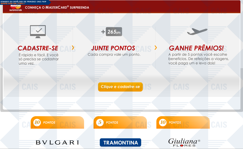 | comentário | A fraude contém um link para o cadastro em uma promoção da Mastercard. O link leva a um site falso que tem o objetivo de roubar dados pessoais da vítima. | |