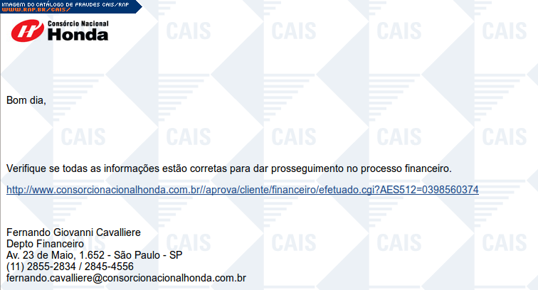 | comentário | A mensagem, em nome da Honda, contém um link para um suposto documento. O arquivo é na verdade um software malicioso que foi identificado como Gen:Variant.Zusy.815 (BitDefender). | |
