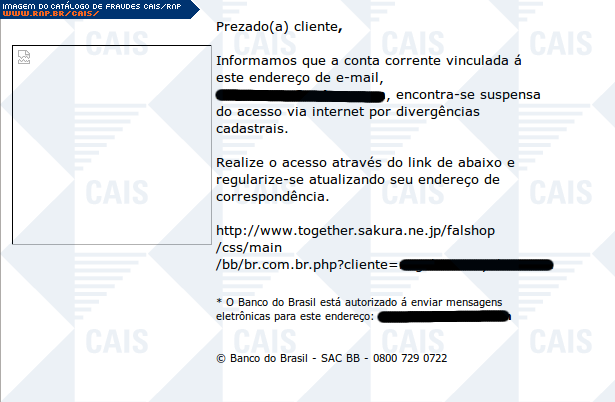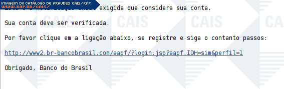 | comentário | Comunicado falso em nome do Banco do Brasil com um link para um suposto registo. O conteúdo malicioso não estava mais disponível no momento da análise. | |