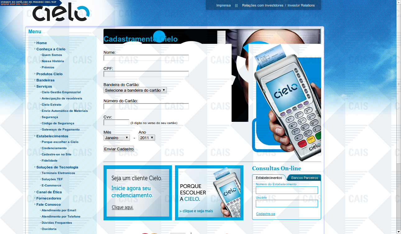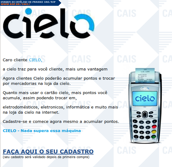 | comentário | A fraude contém um link para o cadastro em uma promoção da Cielo através de um página falsa. | |