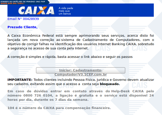 | comentário | A fraude, em nome da Caixa Econômica Federal, com um link para a correção do cadastramento de computadores. O conteúdo malicioso não estava disponível no momento da análise. | |