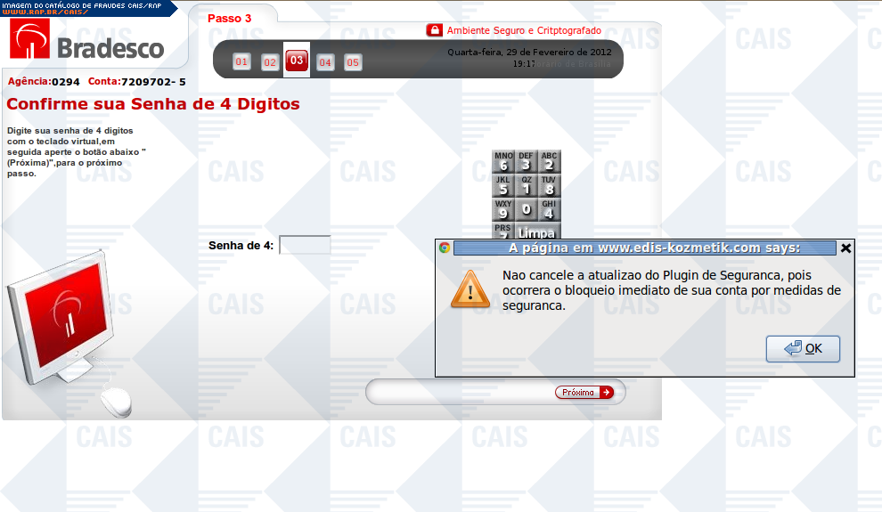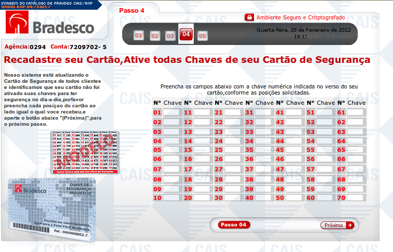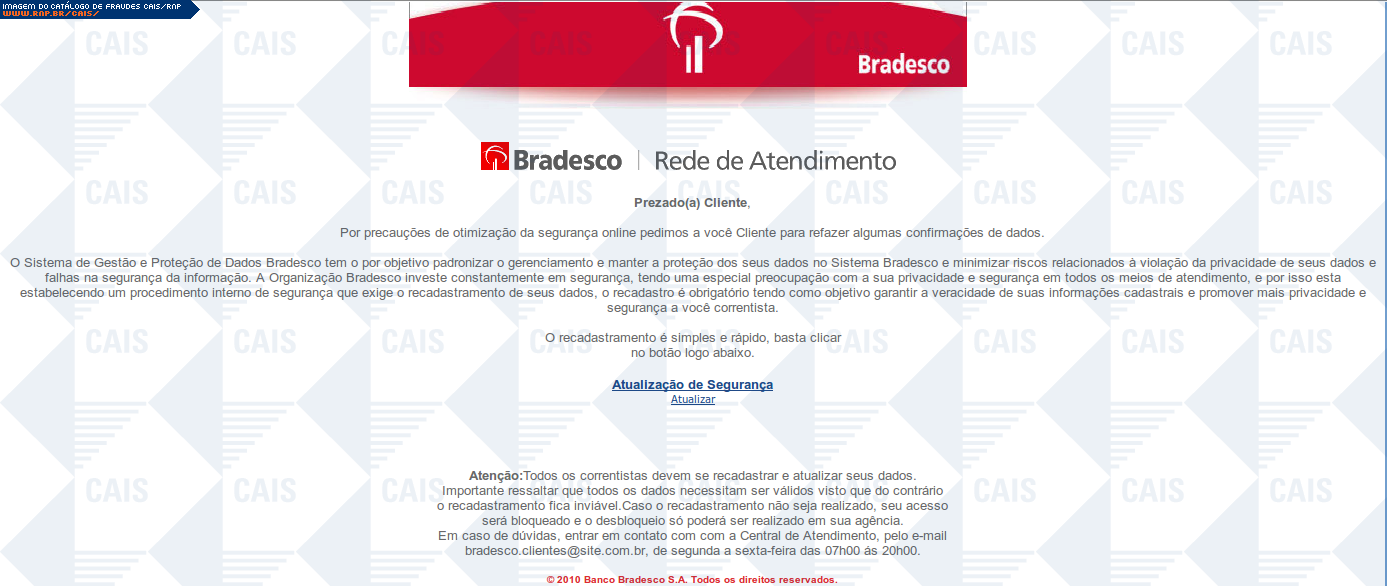 | comentário | Mensagem falsa em nome do banco Bradesco com um link para uma atualização de segurança falsa. O objetivo do site é coletar dados da conta bancária da vítima. | |