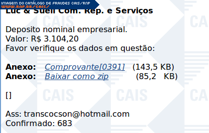 | comentário | A fraude contém um link para o boleto referente a um depósito nominal. O conteúdo malicioso não estava disponível no momento da análise. | |