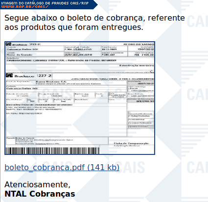 Esta página tem função informativa e educativa. Exibe uma coleção de imagens de phishing scam (fraudes eletrônicas) ou malware (código malicioso) veiculados por meio de spam (e-mail não-solicitado). Trata-se de conteúdo exemplificativo, não exaustivo, uma vez que não é possível contemplar todos os casos de fraudes existentes. Assim, caso você tenha conhecimento de um exemplar que não esteja aqui presente, isto não significa que não seja válido ou real. Inclusive incentivamos que você o envie para análise do CAIS para que, se for o caso, passe a integrar o nosso acervo.