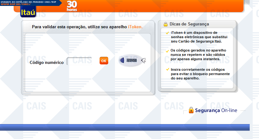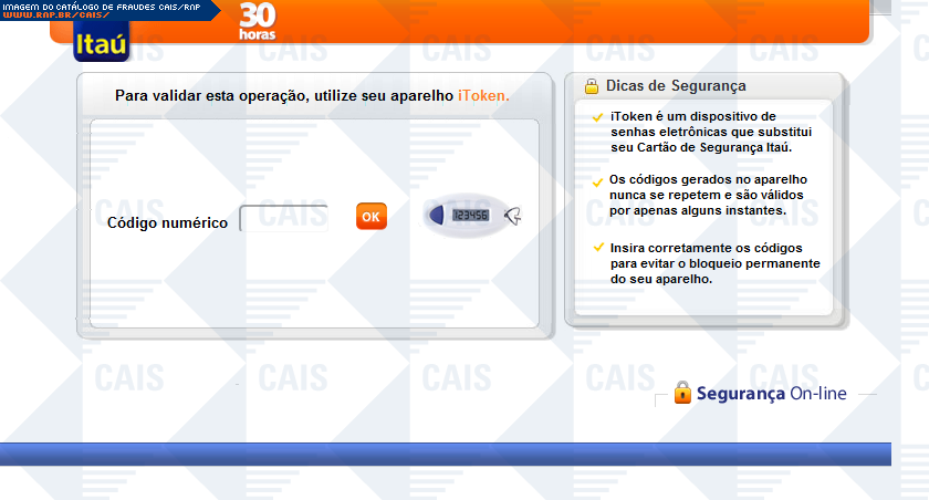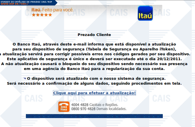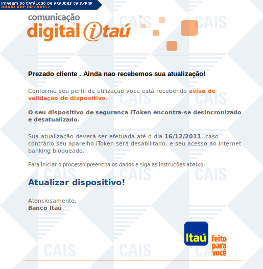 | comentário | Falso alerta em nome do banco Itaú, acerca de necessidade de atualização de dispositivo Token. Há um link para tal atualização, porém este leva à uma falsa página do banco, na qual dados importantes são solicitados. | |