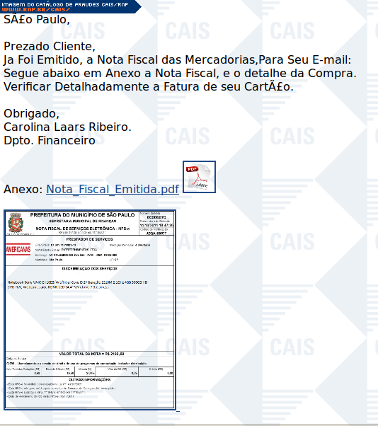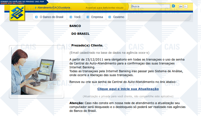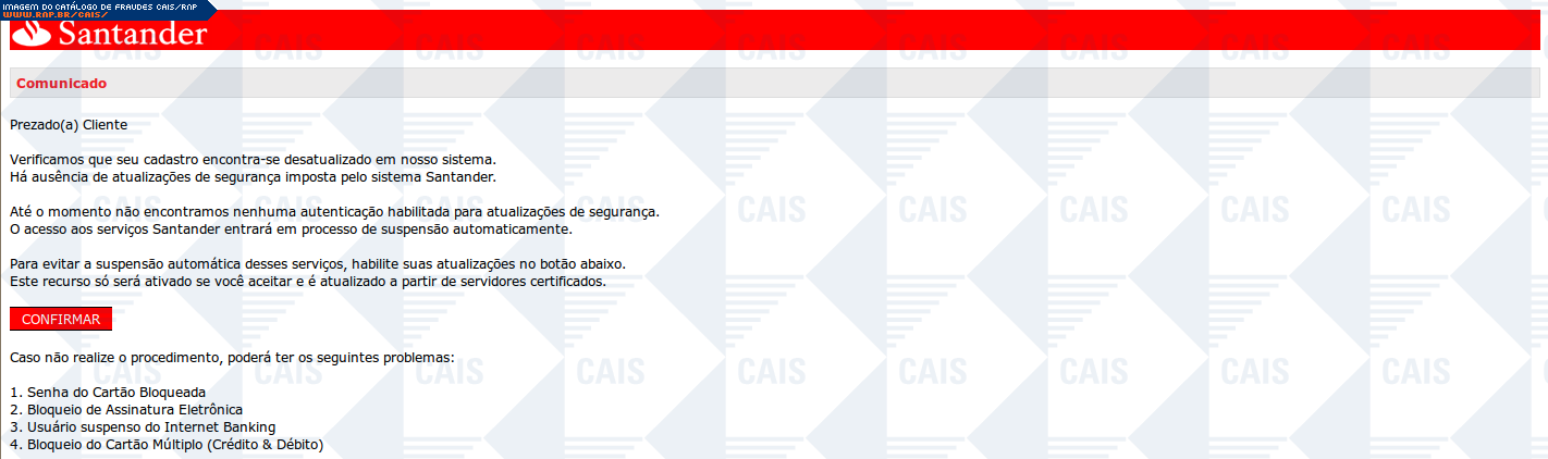 Esta página tem função informativa e educativa. Exibe uma coleção de imagens de phishing scam (fraudes eletrônicas) ou malware (código malicioso) veiculados por meio de spam (e-mail não-solicitado). Trata-se de conteúdo exemplificativo, não exaustivo, uma vez que não é possível contemplar todos os casos de fraudes existentes. Assim, caso você tenha conhecimento de um exemplar que não esteja aqui presente, isto não significa que não seja válido ou real. Inclusive incentivamos que você o envie para análise do CAIS para que, se for o caso, passe a integrar o nosso acervo.