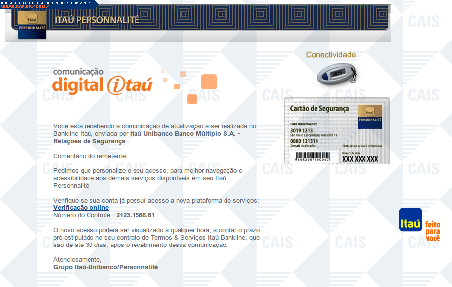 | comentário | A fraude contém um link para a suposta verificação online para clientes do banco Itaú Personalité. O conteúdo malicioso não estava mais disponível no momento da análise. | |