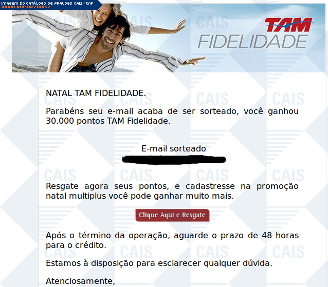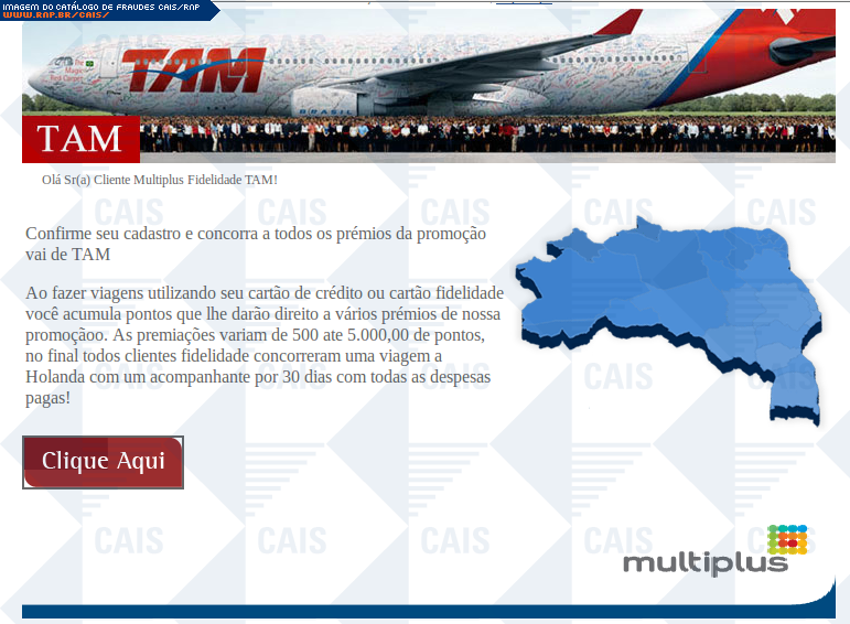 | comentário | A fraude solicita confirmação de cadastro em promoção da TAM. Oferece um link para tal confirmação, contudo este apontava para uma página em branco. | |