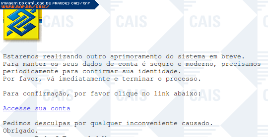 | comentário | Mensagem com texto bastante confuso pedindo que a vítima se recadastre no sistema do Banco do Brasil para continuar acessando sua conta pelo Internet Banking. O link leva a conteúdo malicioso não disponível no momento da análise. | |