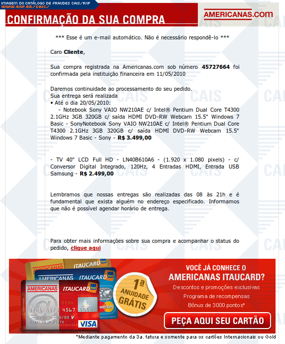 Esta página tem função informativa e educativa. Exibe uma coleção de imagens de phishing scam (fraudes eletrônicas) ou malware (código malicioso) veiculados por meio de spam (e-mail não-solicitado). Trata-se de conteúdo exemplificativo, não exaustivo, uma vez que não é possível contemplar todos os casos de fraudes existentes. Assim, caso você tenha conhecimento de um exemplar que não esteja aqui presente, isto não significa que não seja válido ou real. Inclusive incentivamos que você o envie para análise do CAIS para que, se for o caso, passe a integrar o nosso acervo.