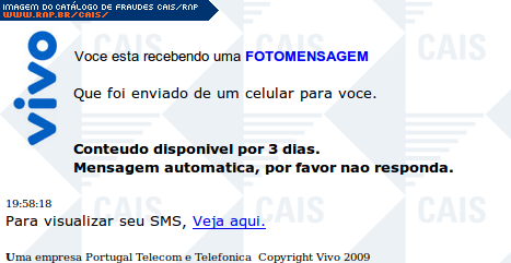 | comentário | Mensagem comunicando recebimento de fotomensagem Vivo e fornecendo um link para a foto em questão. O link leva a um software malicioso identificado como Gen:Trojan.Downloader.xGW@aegTAwnG (F-Secure). | |