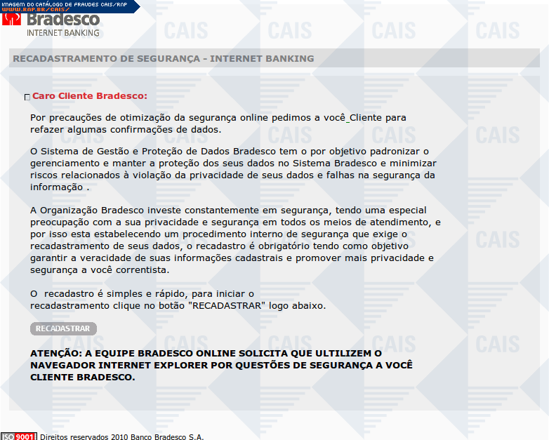 | comentário | Mensagem se passando pelo banco Bradesco notificando sobre a necessidade de recadastramento no sistema para acesso ao Internet Banking. O link fornecido na fraude para o recadastramento leva a uma página falsa destinada a roubar dados confidenciais da vítima.... (leia mais) | |