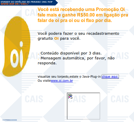 | comentário | Fraude anunciando promoção da Oi que daria direito a R$ 50,00 em ligações de Oi para Oi. Para visualizar o torpedo com as informações da promoção é pedido que a vítima instale um plugin Java. O link para o plugin leva a um malware identificado como Suspicious:W32/Malware!Gemini... (leia mais) | |