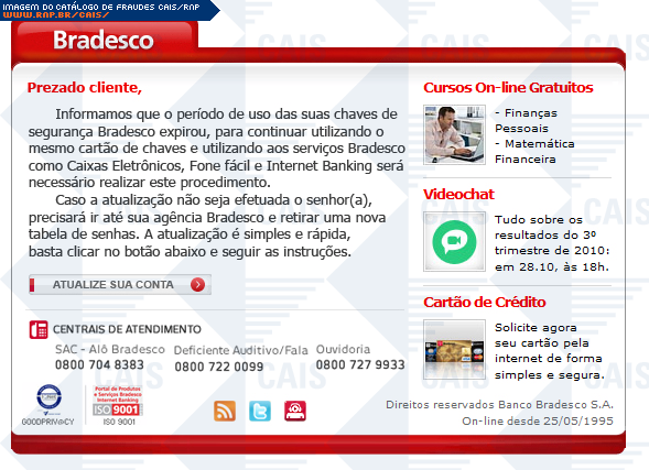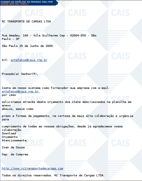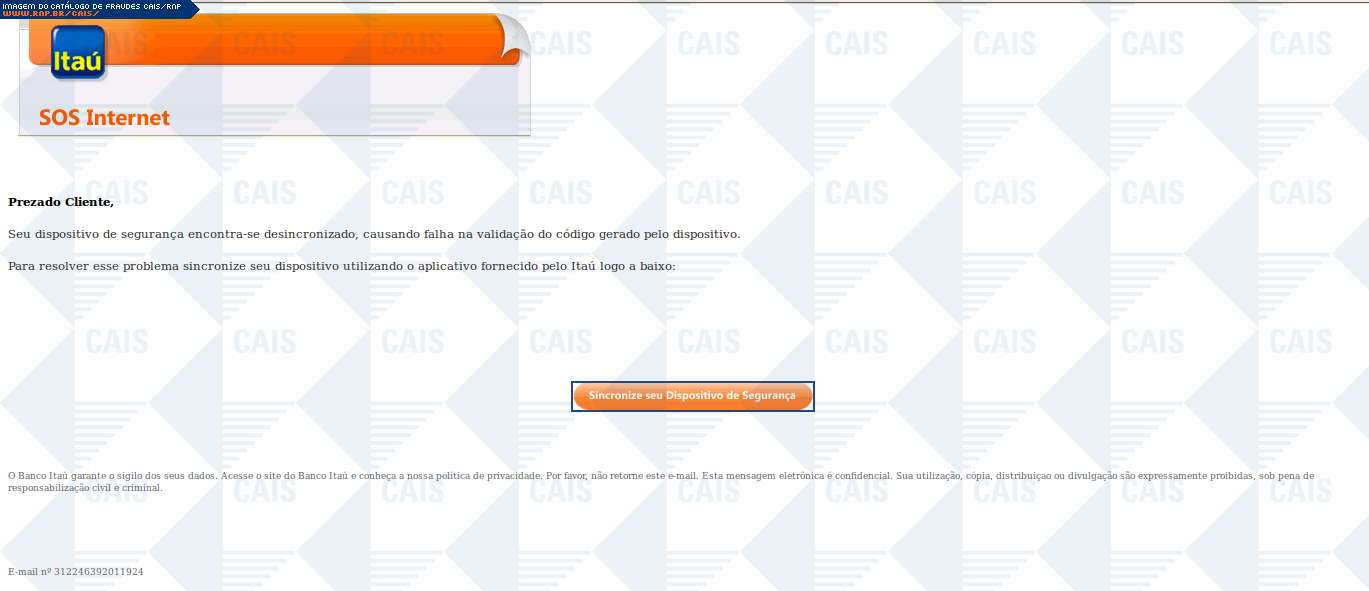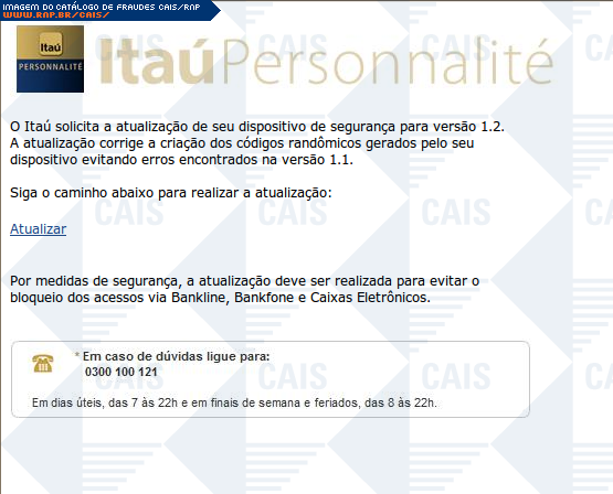 Esta página tem função informativa e educativa. Exibe uma coleção de imagens de phishing scam (fraudes eletrônicas) ou malware (código malicioso) veiculados por meio de spam (e-mail não-solicitado). Trata-se de conteúdo exemplificativo, não exaustivo, uma vez que não é possível contemplar todos os casos de fraudes existentes. Assim, caso você tenha conhecimento de um exemplar que não esteja aqui presente, isto não significa que não seja válido ou real. Inclusive incentivamos que você o envie para análise do CAIS para que, se for o caso, passe a integrar o nosso acervo.