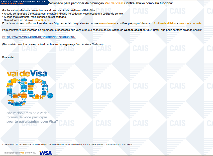 comentário Mensagem que usa o nome da empresa de cartões Visa para comunicar que o cartão da vítima foi selecionado para participar da promoção Vai de Visa. A fraude contém um link para que a vítima confirme a sua inscrição na promoção. O link leva a uma página falsa... (leia mais)