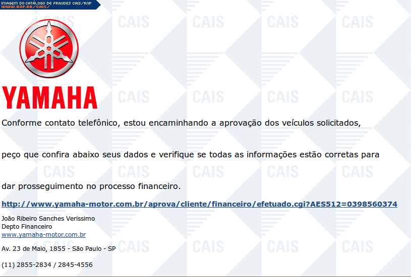 comentário Mensagem falsa se passando pela Yamaha que estaria enviando em anexo um suposto arquivo contendo aaprovação dos veículos solicitados pela vítima. A mensagem pede que a vítima confira os dados e verifique se todas as informações estão corretas para dar prosseguimento... (leia mais)