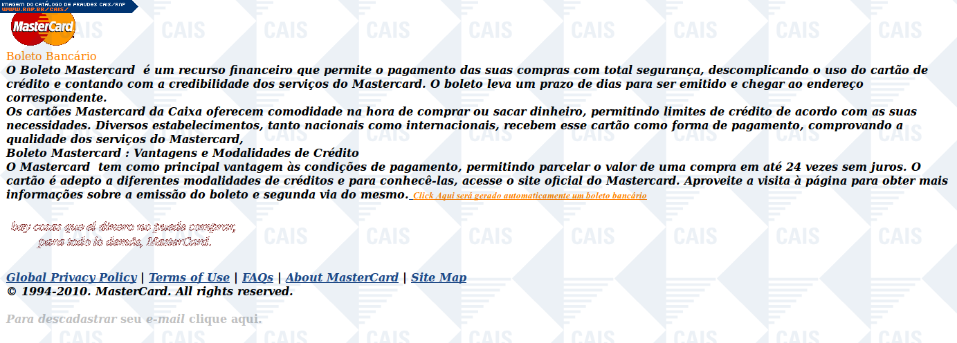 comentário Mensagem que usa o nome da empresa de cartões Mastercard que supostamente estaria oferecendo à vítima o serviço Boleto Mastercad. A fraude contém um link para o gerador de boletos. O link leva a um software malicioso que foi identificado como Gen:Trojan.Heur.bmKfrTubF3ai... (leia mais)