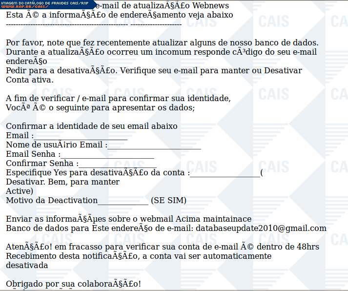 comentário A fraude contém diversos erros de formatação e alicia o usuário a responder o email com seus dados pessoais e a senha de seu email.
