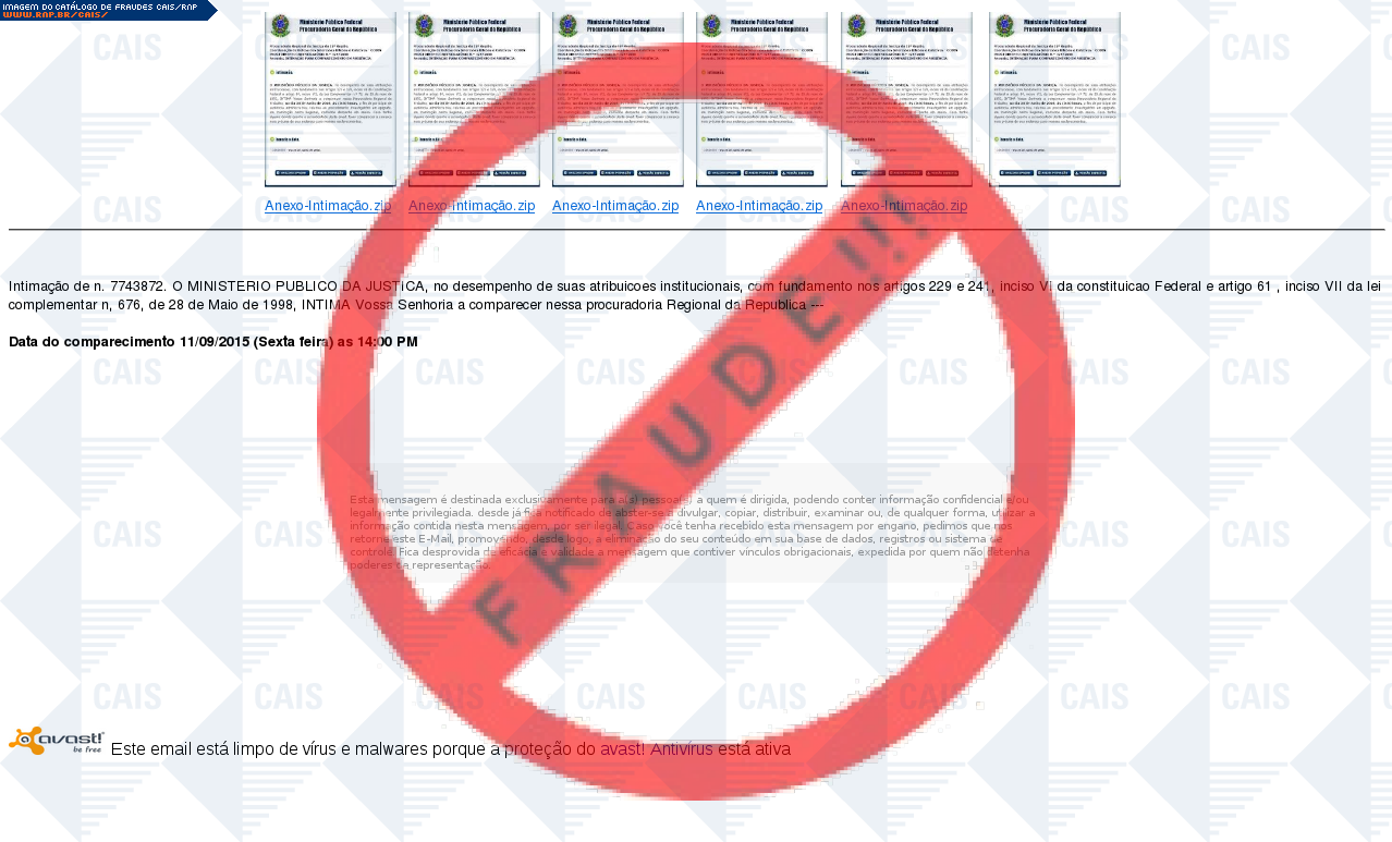 Esta página tem função informativa e educativa. Exibe uma coleção de imagens de phishing scam (fraudes eletrônicas) ou malware (código malicioso) veiculados por meio de spam (e-mail não-solicitado). Trata-se de conteúdo exemplificativo, não exaustivo, uma vez que não é possível contemplar todos os casos de fraudes existentes. Assim, caso você tenha conhecimento de um exemplar que não esteja aqui presente, isto não significa que não seja válido ou real. Inclusive incentivamos que você o envie para análise do CAIS para que, se for o caso, passe a integrar o nosso acervo.