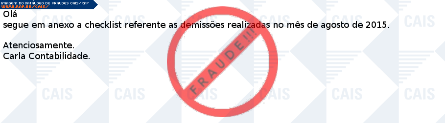 | comentário | A vítima recebe uma mensagem dizendo que há em anexo uma suposta lista com as demissões do mês, porém o anexo é na verdade um malware de nome Trojan.VBS.Agent.LY. | |