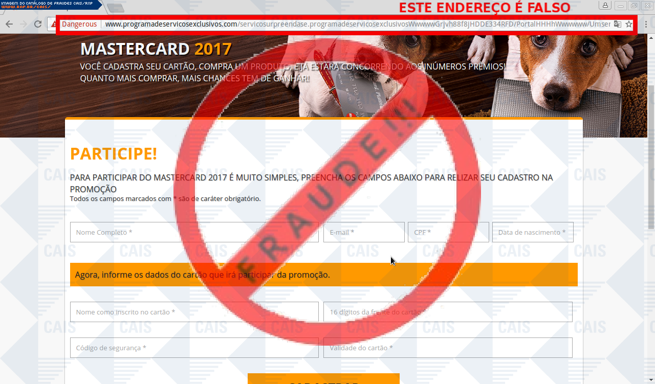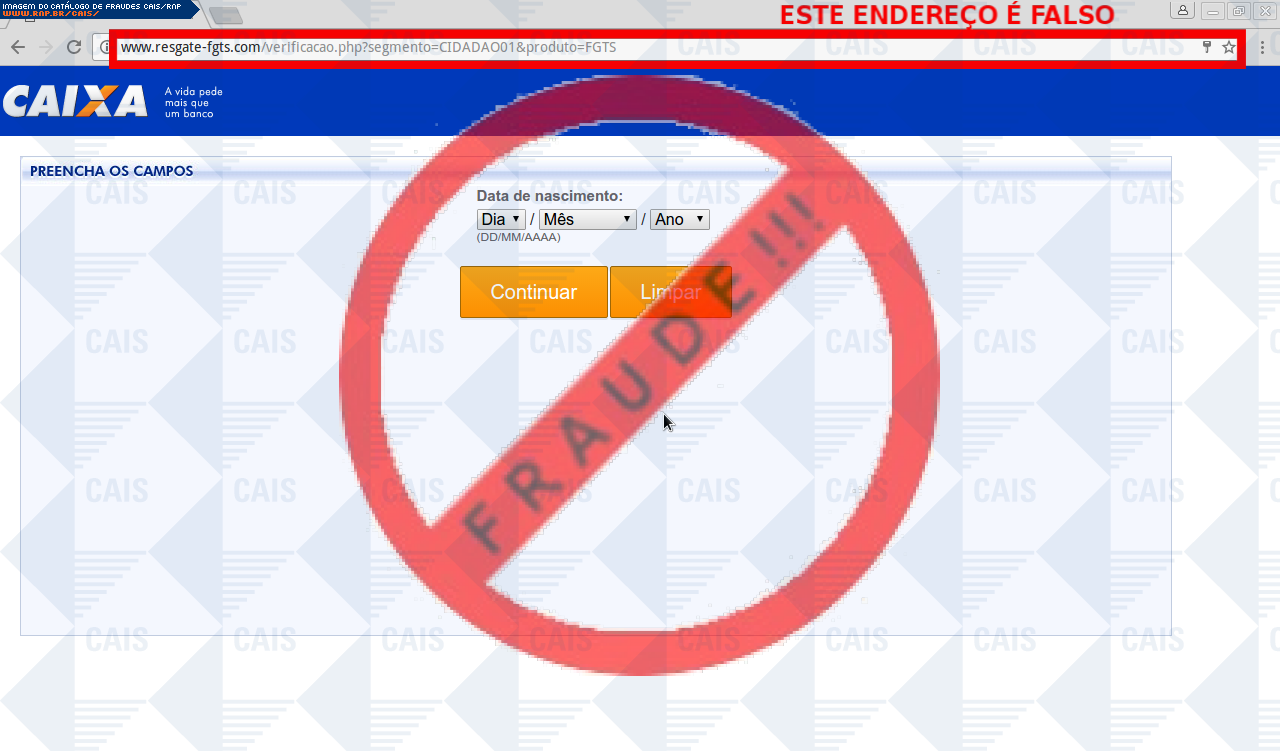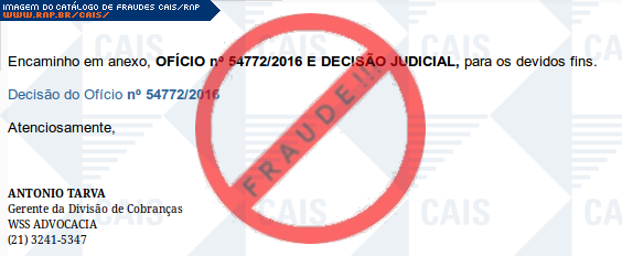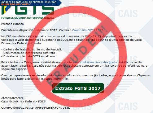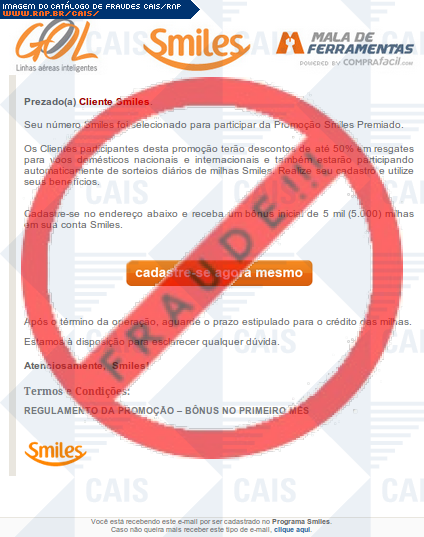 Esta página tem função informativa e educativa. Exibe uma coleção de imagens de phishing scam (fraudes eletrônicas) ou malware (código malicioso) veiculados por meio de spam (e-mail não-solicitado). Trata-se de conteúdo exemplificativo, não exaustivo, uma vez que não é possível contemplar todos os casos de fraudes existentes. Assim, caso você tenha conhecimento de um exemplar que não esteja aqui presente, isto não significa que não seja válido ou real. Inclusive incentivamos que você o envie para análise do CAIS para que, se for o caso, passe a integrar o nosso acervo.