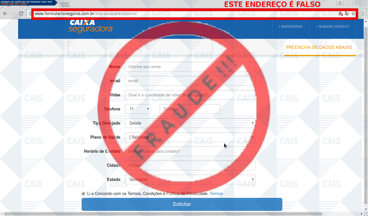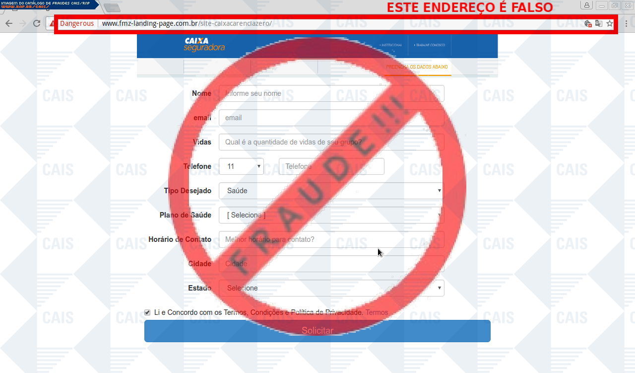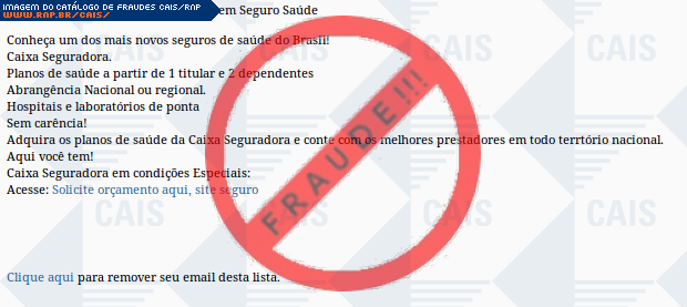 | comentário | A vítima recebe uma mensagem informando sobre vantagens dos seguros da seguradora Caixa Econômica Federal sendo necessário realizar um cadastro para informações sobre orçamento, no entanto a página é falsa criada para roubar dados do usuário. | |