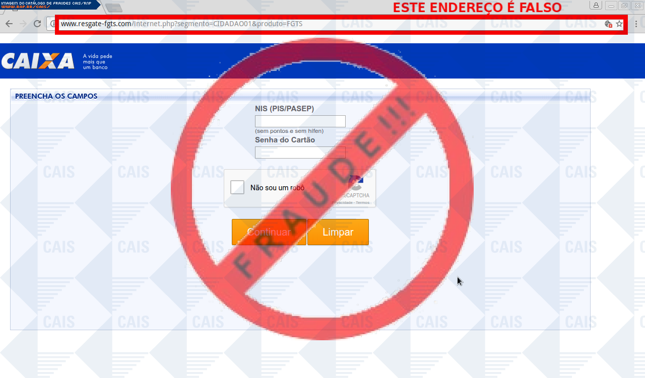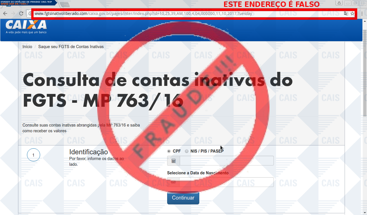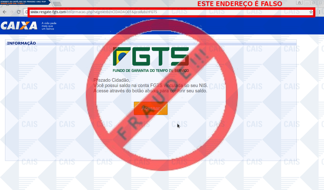 | comentário | A vítima recebe uma mensagem informando sobre valores de sua conta inativa do FGTS que esta disponível para saque e disponibiliza um link para consulta do extrato, no entanto a página é falsa criada para roubar informações da vítima. | |