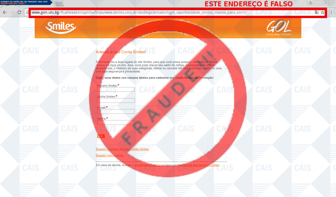| comentário | A vitima recebe uma mensagem informando que foi selecionado para participar do Smiles premiado, e para participar deveria efetuar o login no link disponibilizado, entretanto a página é falsa e criada para roubar os dados do e-mail da vítima. | |
