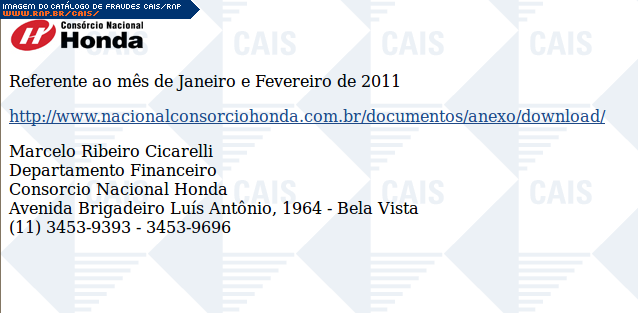 | comentário | Mensagem falsa do Consórcio Nacional Honda contendo um link para as faturas atrasadas dos meses de Janeiro e Fevereiro. O link leva a conteúdo malicioso que não estava disponível no momento da análise. | |