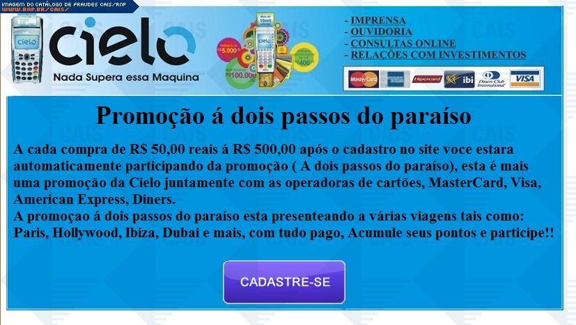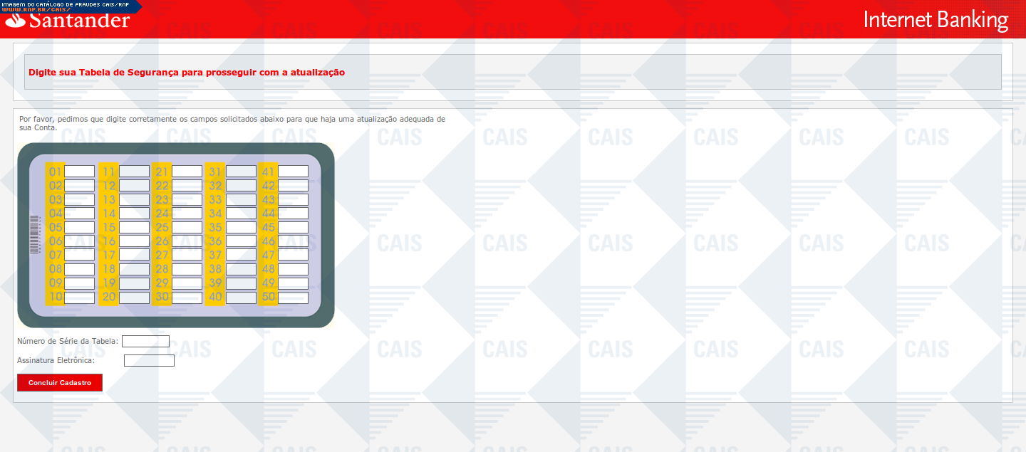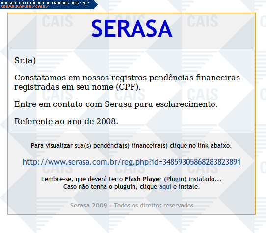Esta página tem função informativa e educativa. Exibe uma coleção de imagens de phishing scam (fraudes eletrônicas) ou malware (código malicioso) veiculados por meio de spam (e-mail não-solicitado). Trata-se de conteúdo exemplificativo, não exaustivo, uma vez que não é possível contemplar todos os casos de fraudes existentes. Assim, caso você tenha conhecimento de um exemplar que não esteja aqui presente, isto não significa que não seja válido ou real. Inclusive incentivamos que você o envie para análise do CAIS para que, se for o caso, passe a integrar o nosso acervo.