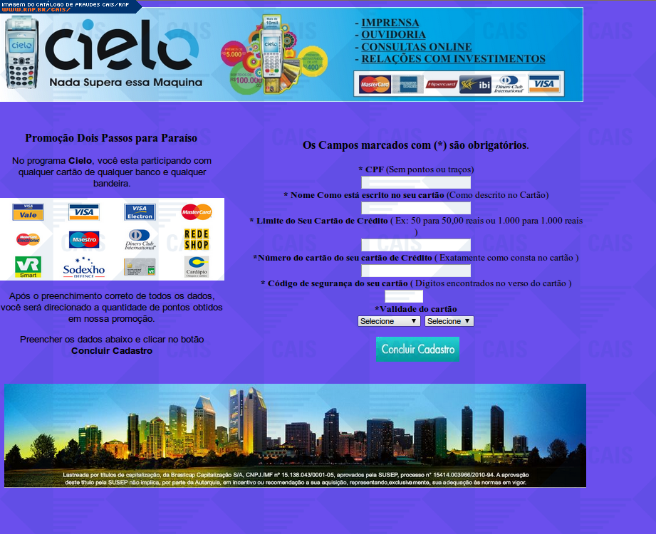 Com a disponibilização pública deste serviço, não é intenção do Centro de Atendimento a Incidentes de Segurança (CAIS) da Rede Nacional de Ensino e Pesquisa (RNP) violar direitos autorais sobre marcas registradas ou logotipos de empresas que porventura constem das amostras. O objetivo é tão somente alertar os usuários sobre as espécies de golpes que se utilizam de tais propriedades intelectuais ou industriais de forma criminosa.