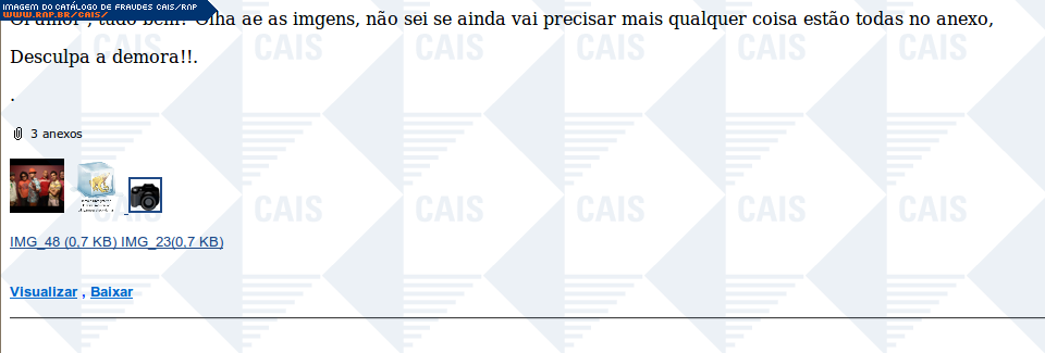 | comentário | Mensagem supostamente enviada por um amigo da vítima contendo miniaturas de imagens e um link para o download das fotos. O link a conteúdo malicioso que não estava mais disponível no momento da análise. | |