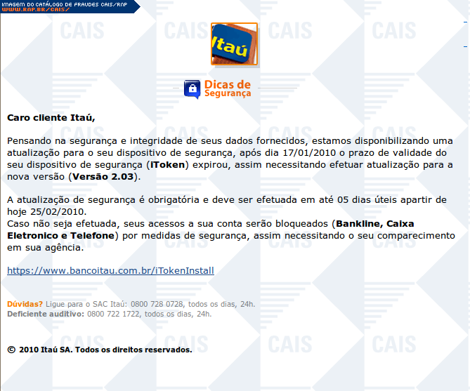 | comentário | Mensagem falsa do banco Itaú solicitando que a vítima efetue a atualização obrigatória do dispositivo de segurança. O link para a suposta atualização leva a conteúdo malicioso que não estava disponível no momento da análise. | |