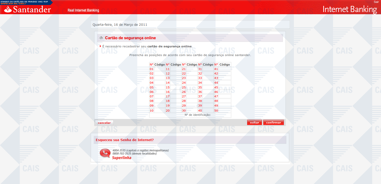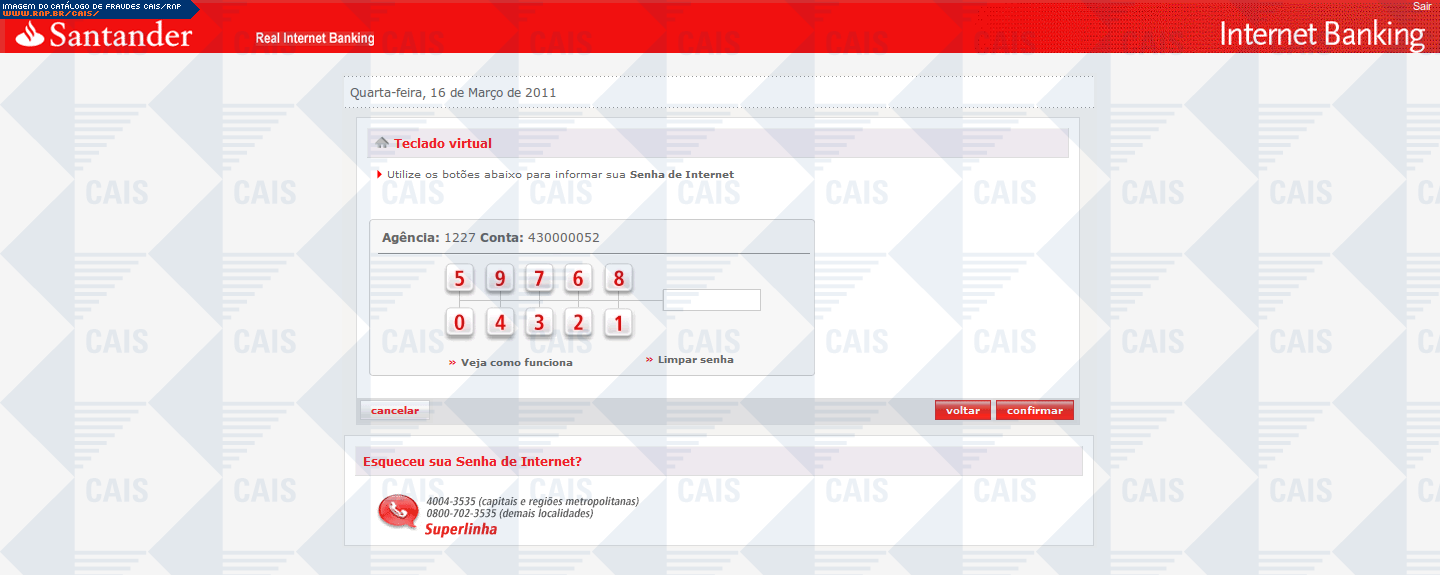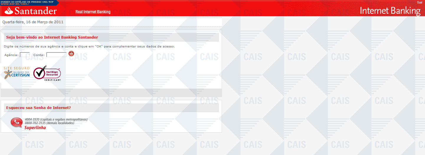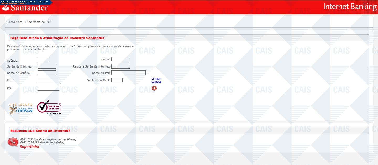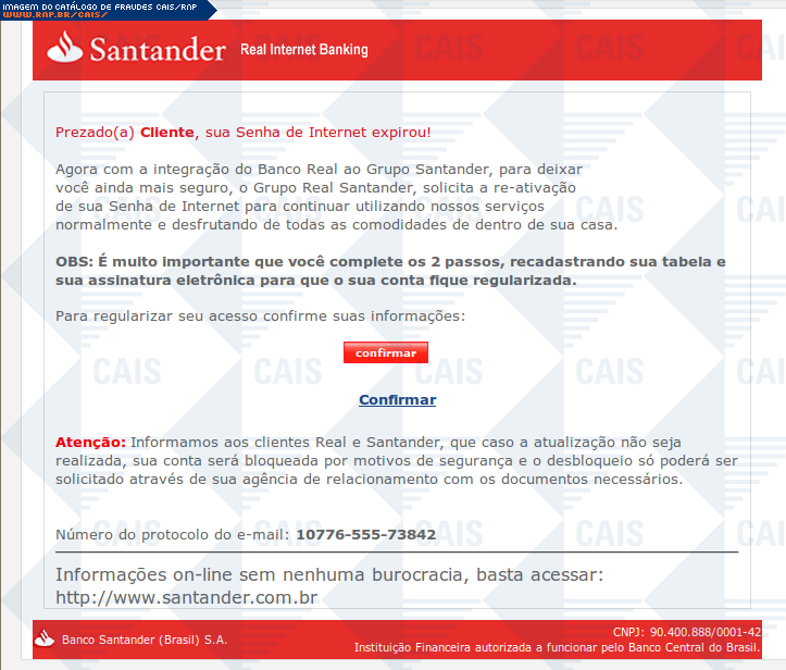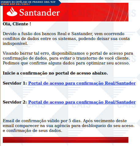 | comentário | Mensagem informando que, devido à fusão dos bancos Real e Santander, estão ocorrendo conflitos de dados entre os sistemas e, por isso, a vítima deve confirmar seu dados através dos links. Os links levam a uma página falsa destinada a roubar dados financeiros... (leia mais) | |