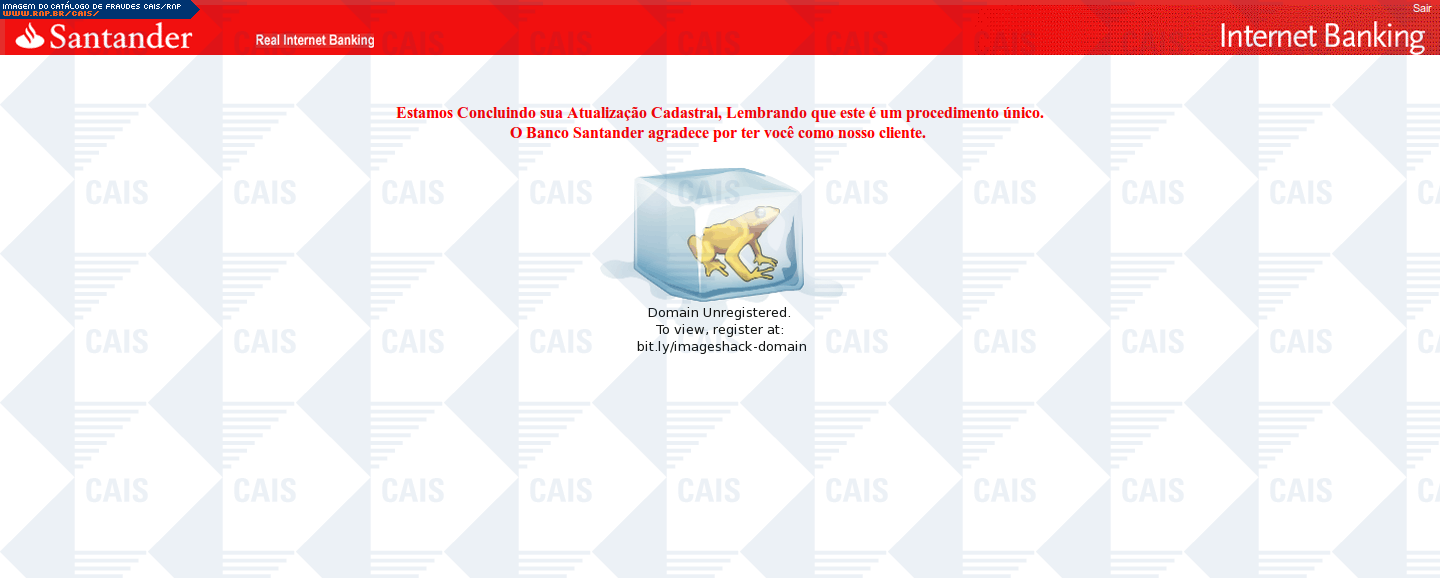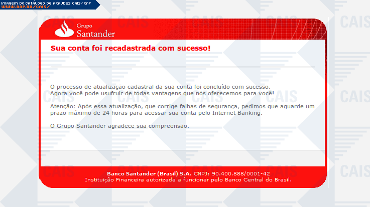 | comentário | O suposto comunicado, em nome do Grupo Santander, alerta a vítima que sua senha de internet expirou. A fraude informa que a reativação é obrigatória e, caso não seja realizada, a conta da vítima será bloqueada. O link leva a uma página falsa destinada a coletar... (leia mais) | |