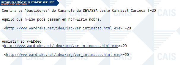 | comentário | Mensagem que contém um link para um suposto vídeo contendo cenas impróprias do camarote Devassa. O link leva ao software malicioso identificado como Artemis!36F2D800725D (McAfee). | |