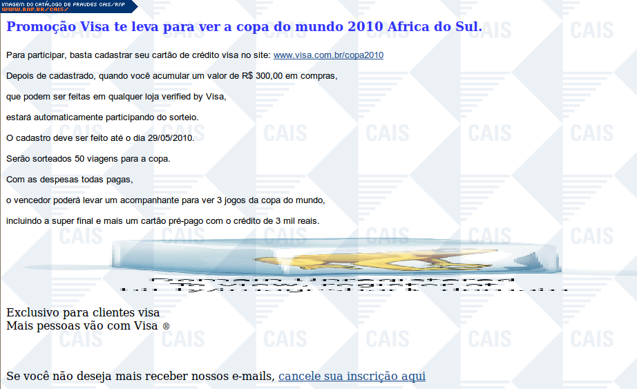| comentário | Mensagem falsa da Visa divulgando uma promoção. O link para o cadastro na promoção leva a conteúdo malicioso que não estava disponível no momento da análise. | |