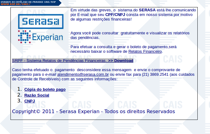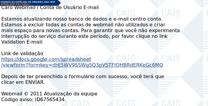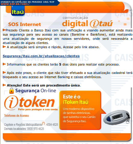 Esta página tem função informativa e educativa. Exibe uma coleção de imagens de phishing scam (fraudes eletrônicas) ou malware (código malicioso) veiculados por meio de spam (e-mail não-solicitado). Trata-se de conteúdo exemplificativo, não exaustivo, uma vez que não é possível contemplar todos os casos de fraudes existentes. Assim, caso você tenha conhecimento de um exemplar que não esteja aqui presente, isto não significa que não seja válido ou real. Inclusive incentivamos que você o envie para análise do CAIS para que, se for o caso, passe a integrar o nosso acervo.