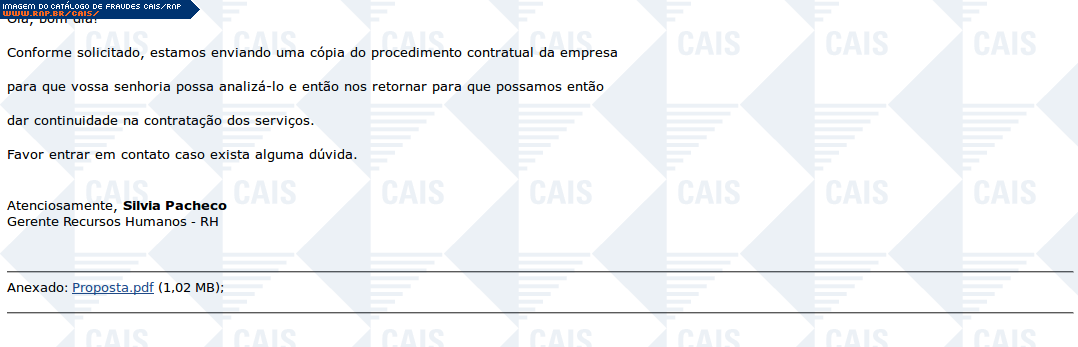| comentário | A mensagem diz à vítima que ela está recebendo um documento que havia pedido referente a uma proposta de contrato. O documento na verdade é malicioso, mas seu conteúdo não estava mais disponível no momento da análise. | |