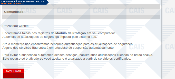 | comentário | A fraude alerta o cliente acerca de uma falha de proteção ocasionada por uma ausência de atualização. A página contém um link de confirmação, porém este já não estava mais disónível no momento da analise. | |