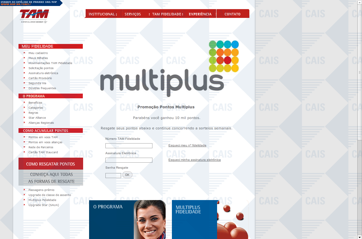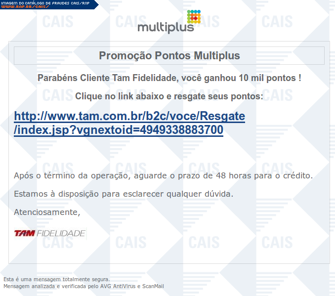 | comentário | A mensagem informa que a vítima foi premiada em na promoção Multiplus da TAM. O link para o resgate do prêmio leva a uma página falsa, destinada a coletar dados pessoais da vítima. | |