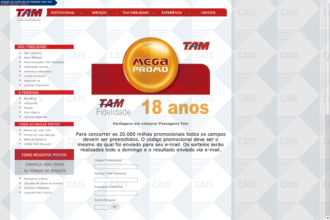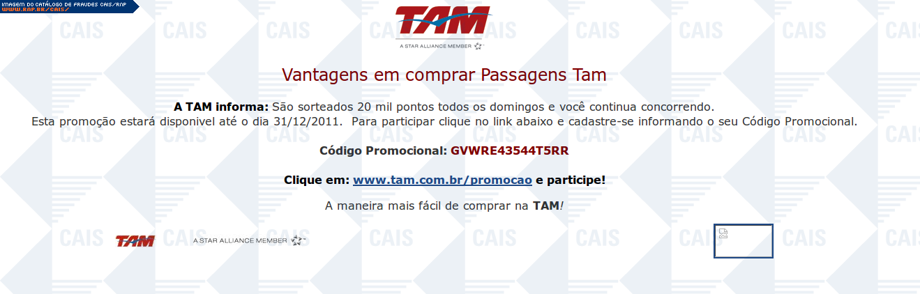 | comentário | A fraude tenta aliciar a vítima a se cadastrar em uma promoção da TAM através de um site falso, que tem o objetivo de coletar dados pessoais da vítima. | |