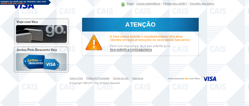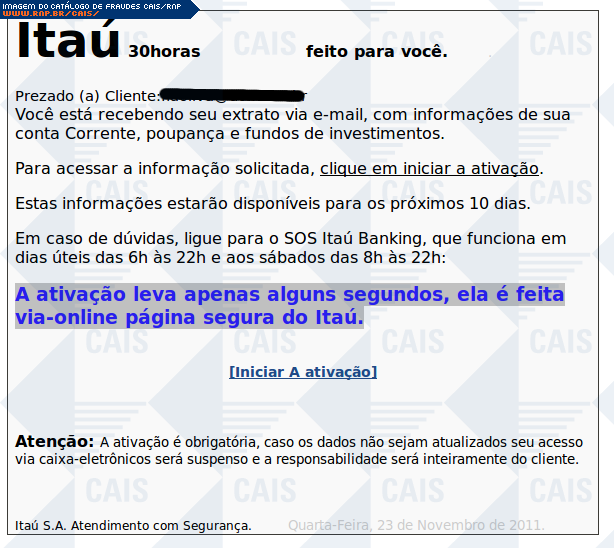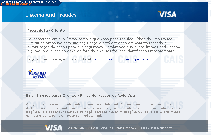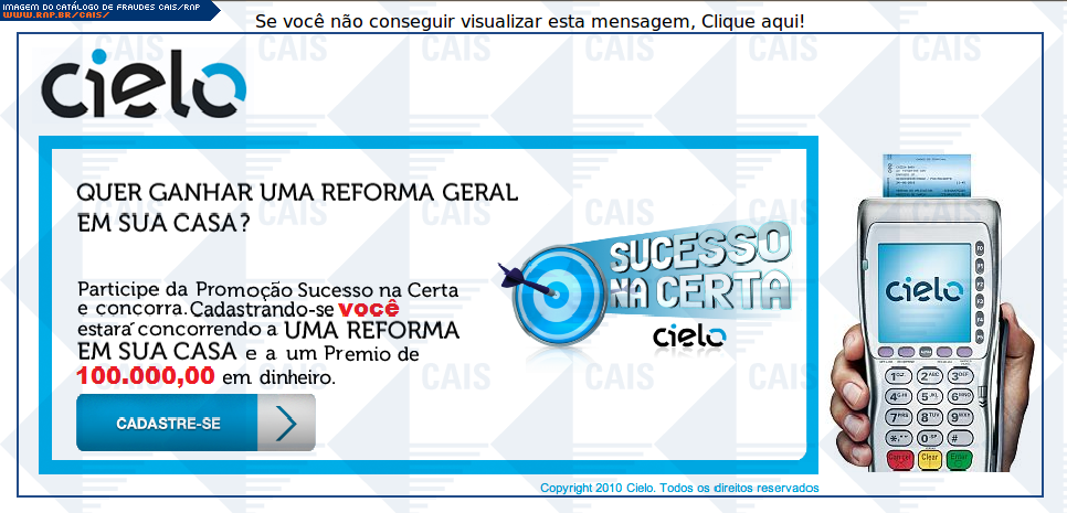 Esta página tem função informativa e educativa. Exibe uma coleção de imagens de phishing scam (fraudes eletrônicas) ou malware (código malicioso) veiculados por meio de spam (e-mail não-solicitado). Trata-se de conteúdo exemplificativo, não exaustivo, uma vez que não é possível contemplar todos os casos de fraudes existentes. Assim, caso você tenha conhecimento de um exemplar que não esteja aqui presente, isto não significa que não seja válido ou real. Inclusive incentivamos que você o envie para análise do CAIS para que, se for o caso, passe a integrar o nosso acervo.