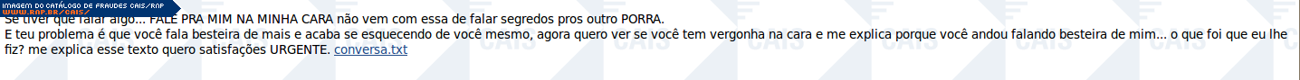 | comentário | Mensagem de suposta conhecida dizendo que a vítima falou mal dela com outras pessoas. A fraude contém um link para a suposta conversa. O conteúdo já havia sido retirado no momento da análise. | |