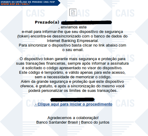 | comentário | A fraude contém um link para uma sincronização falsa do dispositivo Token. A mensagem contém um link que leva a uma página falsa, destinada a roubar dados pessoais da vítima. | |