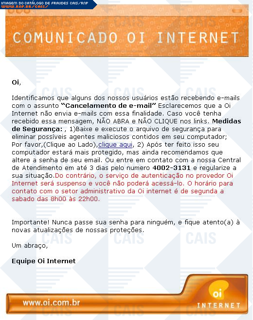 Esta página tem função informativa e educativa. Exibe uma coleção de imagens de phishing scam (fraudes eletrônicas) ou malware (código malicioso) veiculados por meio de spam (e-mail não-solicitado). Trata-se de conteúdo exemplificativo, não exaustivo, uma vez que não é possível contemplar todos os casos de fraudes existentes. Assim, caso você tenha conhecimento de um exemplar que não esteja aqui presente, isto não significa que não seja válido ou real. Inclusive incentivamos que você o envie para análise do CAIS para que, se for o caso, passe a integrar o nosso acervo.